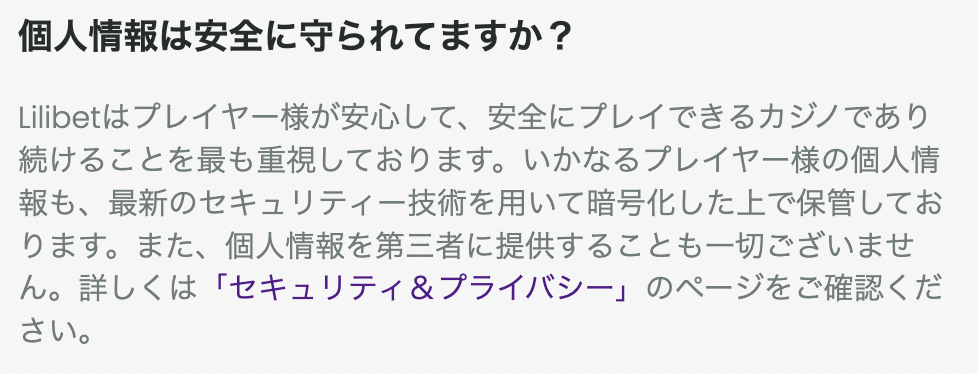 リリベットは「いかなるプレイヤー様の個人情報も、最新のセキュリティー技術を用いて暗号化した上で保管しております。また、個人情報を第三者に提供することも一切ございません。」との記載がある、安全なオンラインカジノです。