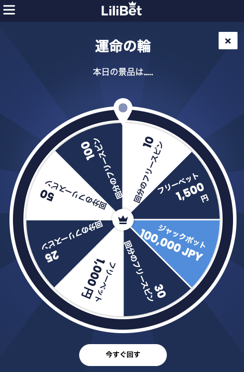 続いては、リリベットで1番人気のキャンペーン「運命の輪」についてご紹介いたします。リリベットでしか体験できないお得なキャンペーンを活用して、カジノもスポーツもお得に攻略してくださいね。