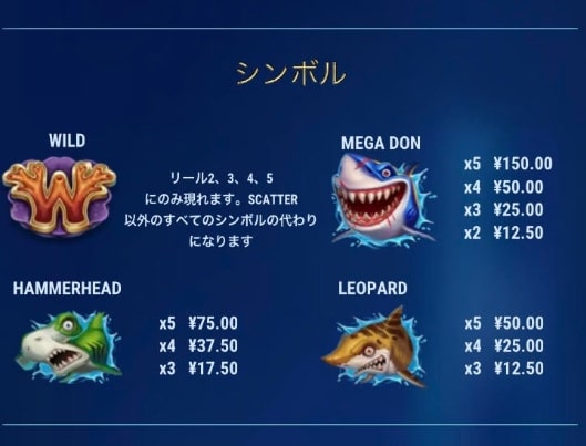 Mega Don Feeding Frenzyに登場するシンボルの中で最も高配当なのが、メガドン、ハンマーヘッドシャーク、レオパードです。WILDシンボルは、スキャッターシンボル以外のすべてのシンボルの代わりになります。