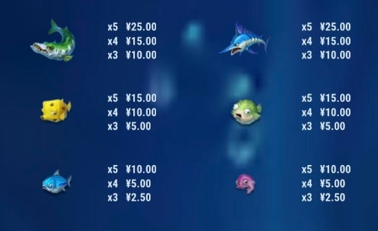 低配当シンボルは、緑の魚、角がある魚、黄色の魚、フグの魚、青の魚、ピンクの魚です。