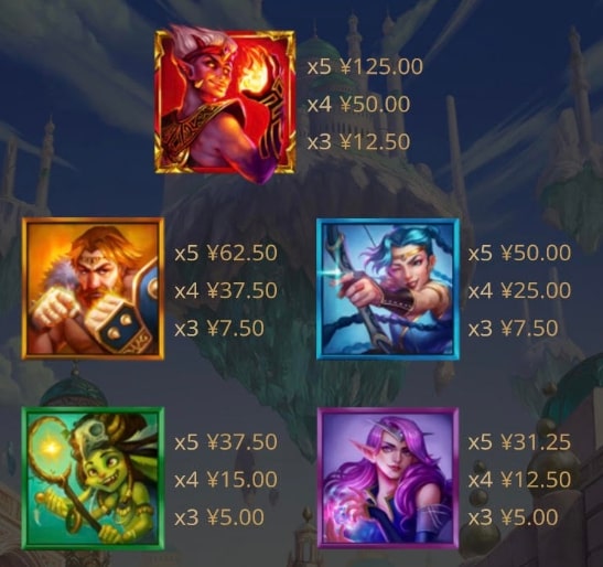 Tales of Mithrune Syn’s Fortuneに登場するシンボルの中で最も高配当なのが、赤い火の神シン、オレンジの巨人、青の弓使い、緑のゴブリン、紫の髪の魔女となっています。