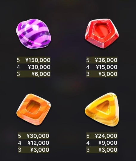 高額配当のシンボルは、紫、赤、オレンジ、黄色のキャンディーです。