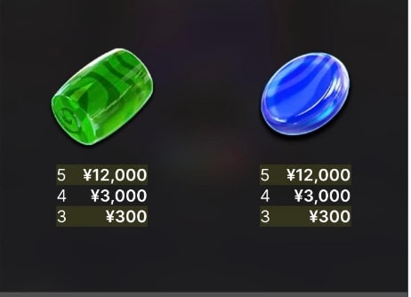 低額のシンボルは緑と青のキャンディーです。